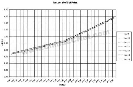 按照原理图建立电路后,得到了以下性能数据。首先,绘出实际的输出电流IOUT ,作为是可编程参考电压VREF的函数的曲线。VREF可以从1.340 V 到2.090 V以50 mV的步长,以及在 2.140 V 到 3.540 V以100 mV的步长进行选择。其性能在图6中一目了然。