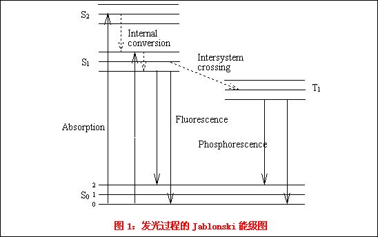 OLED是基于有机材料的一种电流型半导体发光器件。其典型结构是在ITO玻璃上制作一层几十纳米厚的有机发光材料作发光层,发光层上方有一层低功函数的金属电极。当电极上加有电压时,发光层就产生光辐射。和无机薄膜电致发光器件(TFEL)不同,有机材料的电致发光属于注入式的复合发光,其发光机理是由正极和负极产生的空穴和电子在发光材料中复合成激子,激子的能量转移到发光分子,使发光分子中的电子被激发到激发态,而激发态是一个不稳定的状态,去激过程产生可见光。为增强电子和空穴的注入和传输能力,通常又在ITO和发光层间增加一层有机空穴传输材料或/和在发光层与金属电极之间增加一层电子传输层,以提高发光效率。发光过程的Jablonski能级图如图 1所示: